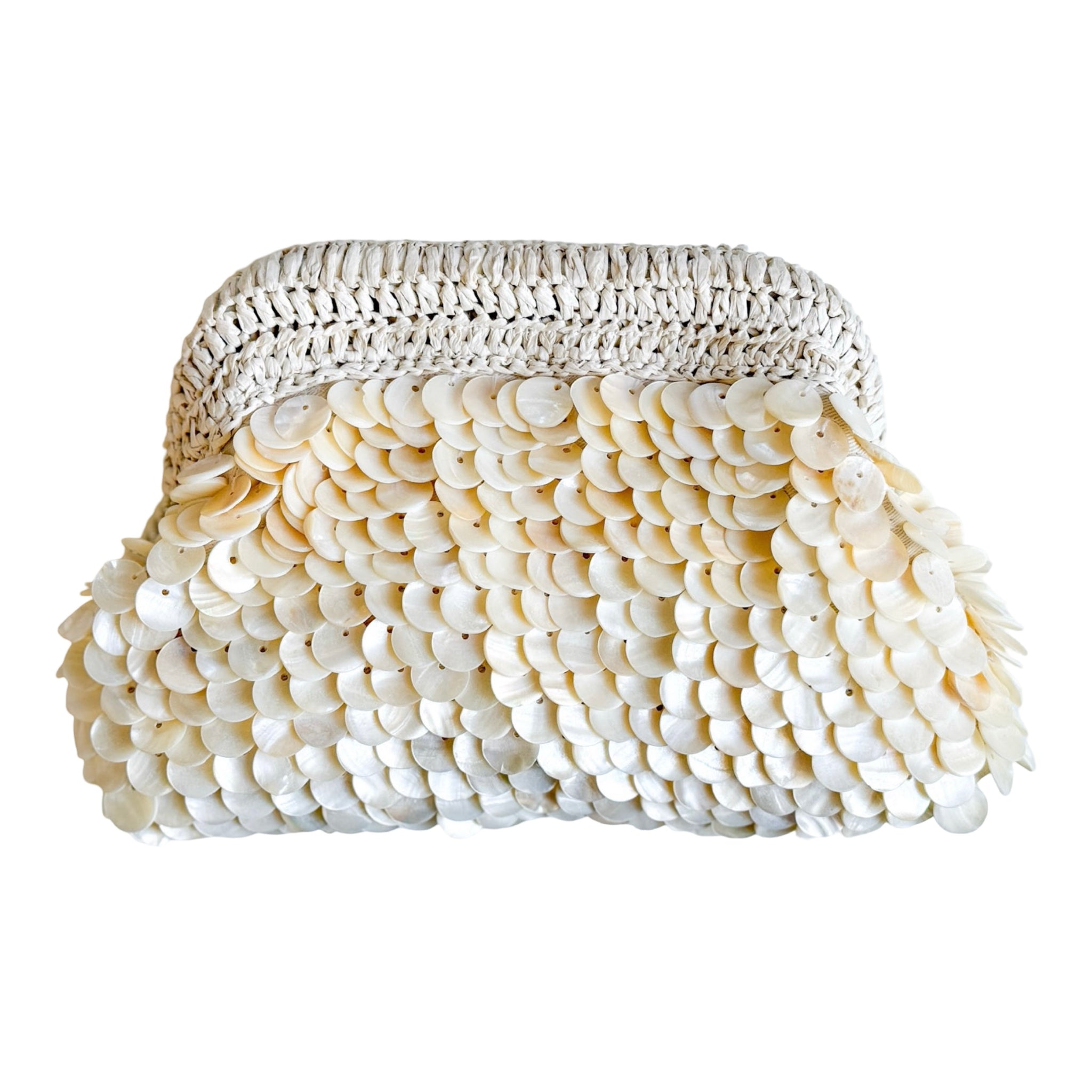This beautifully structured piece features a woven natural fiber base paired with cascading layers of luminous shell discs that create soft texture, dimension, and subtle shimmer with every movement. Handbeaded by our talented artisans, this handbag is an expression of coastal luxury. Perfect for spring and summer styling, resort vacations or beach dinners.