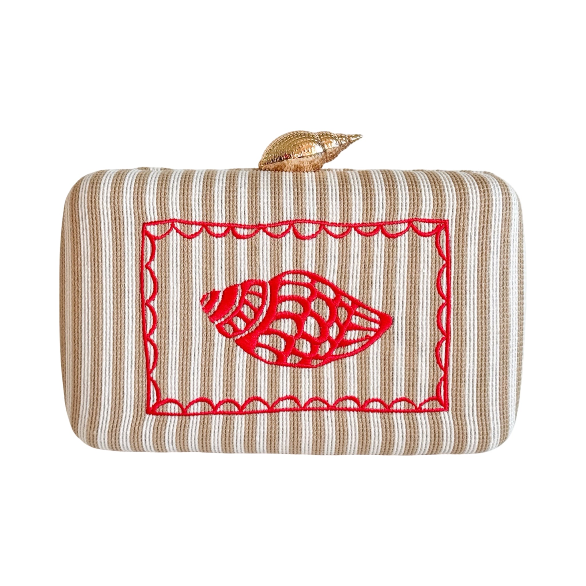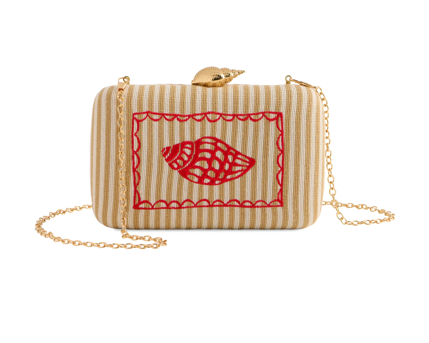 Meet the beautiful Saltwater Seashell Clutch Handbag. Featuring a chic striped or woven design and an elegant gold seashell clasp, this clutch is as stylish as it is functional. It includes a detachable cross-body chain, magnetic snap closure, and a handy inner zip pocket to keep your essentials in place. Whether you’re heading to brunch or a breezy beach soirée, the Saltwater Seashell handbag has you covered.