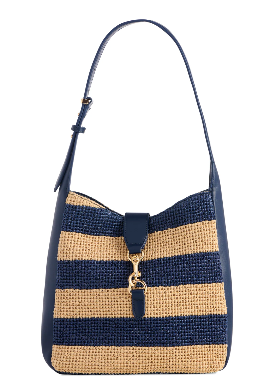 The Stella Blu Raffia Shoulder Bag is a lightweight woven bucket bag featuring navy and natural raffia stripes, an adjustable shoulder strap, and secure dog-clip closure. Designed for everyday wear, this summer handbag includes interior slip and zip pockets to keep essentials organized—perfect for brunch, travel, and beachside days.